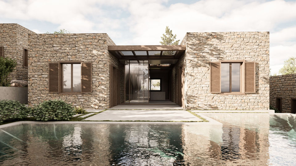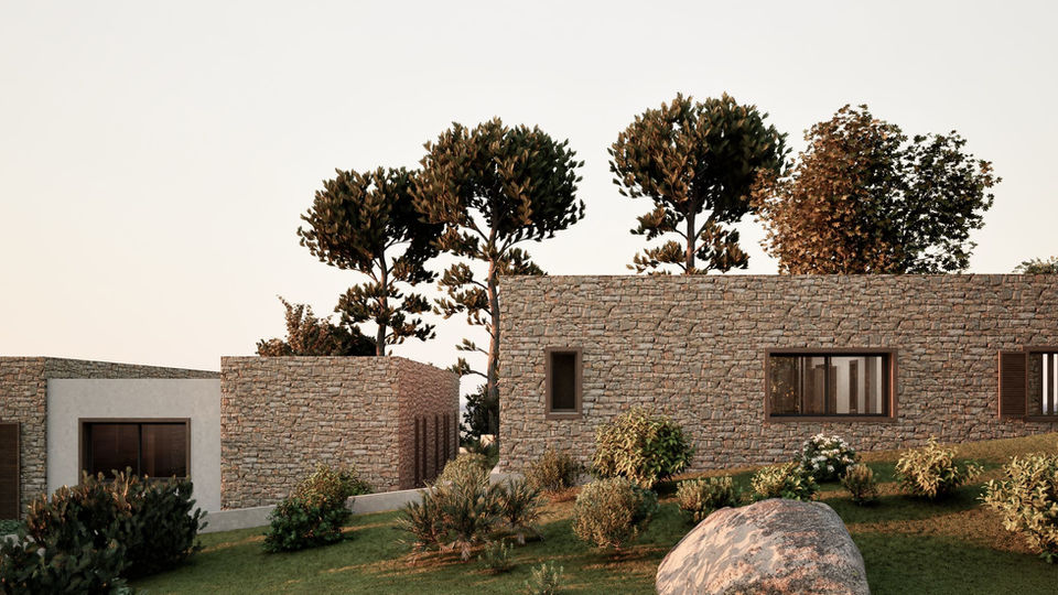 The Palairos Lofos project will create four independent natural stone houses, with wooden shutters, modern and fluid living, with central courtyards open to the sky and set in gardens, surrounded by nature, with a view to the sea.